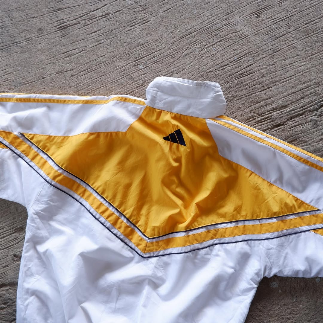 Colorway: Bright yellow and white panels with classic navy blue piping and adidas 3-stripe details on sleeves