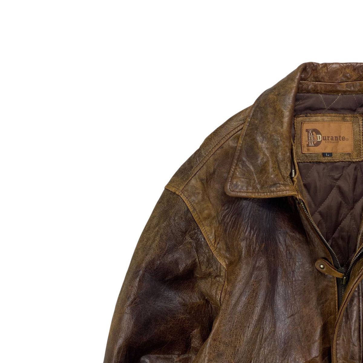 This rugged Durante leather jacket exudes vintage charm and durability. With its rich brown leather exterior, the jacket features a quilted lining for added warmth and comfort. The classic design is complemented by two front snap pockets and a Durant branded logo on the chest. The elastic cuffs and waistband add an extra element of flexibility, making it both stylish and functional. The jacket’s rich leather has developed a beautiful patina, adding character to the piece.