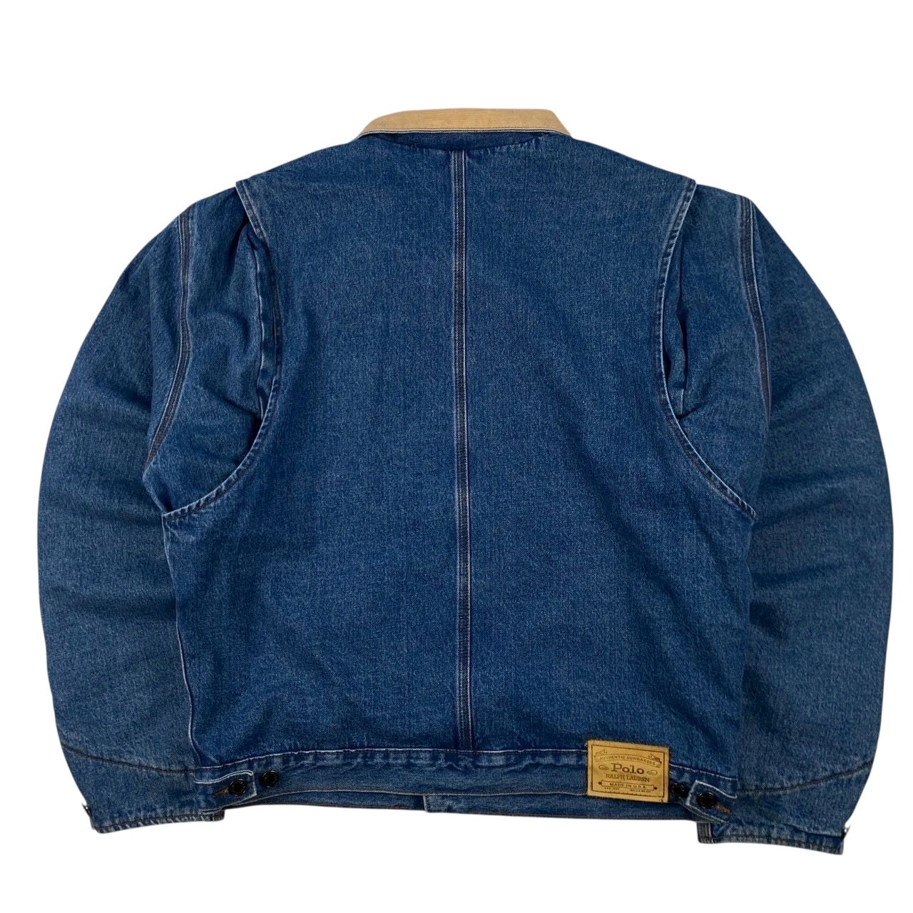 This Polo Ralph Lauren denim jacket combines a rugged blue denim exterior with a soft, contrasting corduroy collar. The classic Polo Ralph Lauren branding is evident with the logo on the chest pocket and the leather patch at the waist, emphasizing the jacket’s vintage appeal. The plaid flannel lining provides extra warmth, making this jacket perfect for cooler weather. With its structured design and durable construction, this jacket is a must-have for both casual and semi-casual looks.