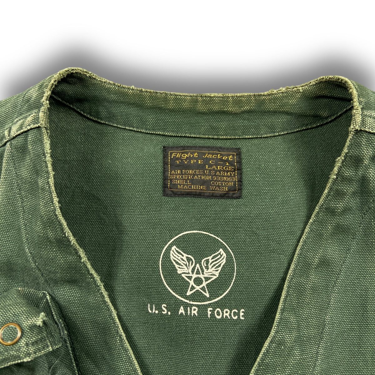 Original spec label reads: “Flight Jacket TYPE C LARGE Air Forces U.S. Army Specification 938665 Shell Cotton Machine Wash”