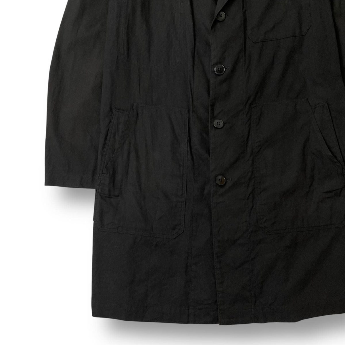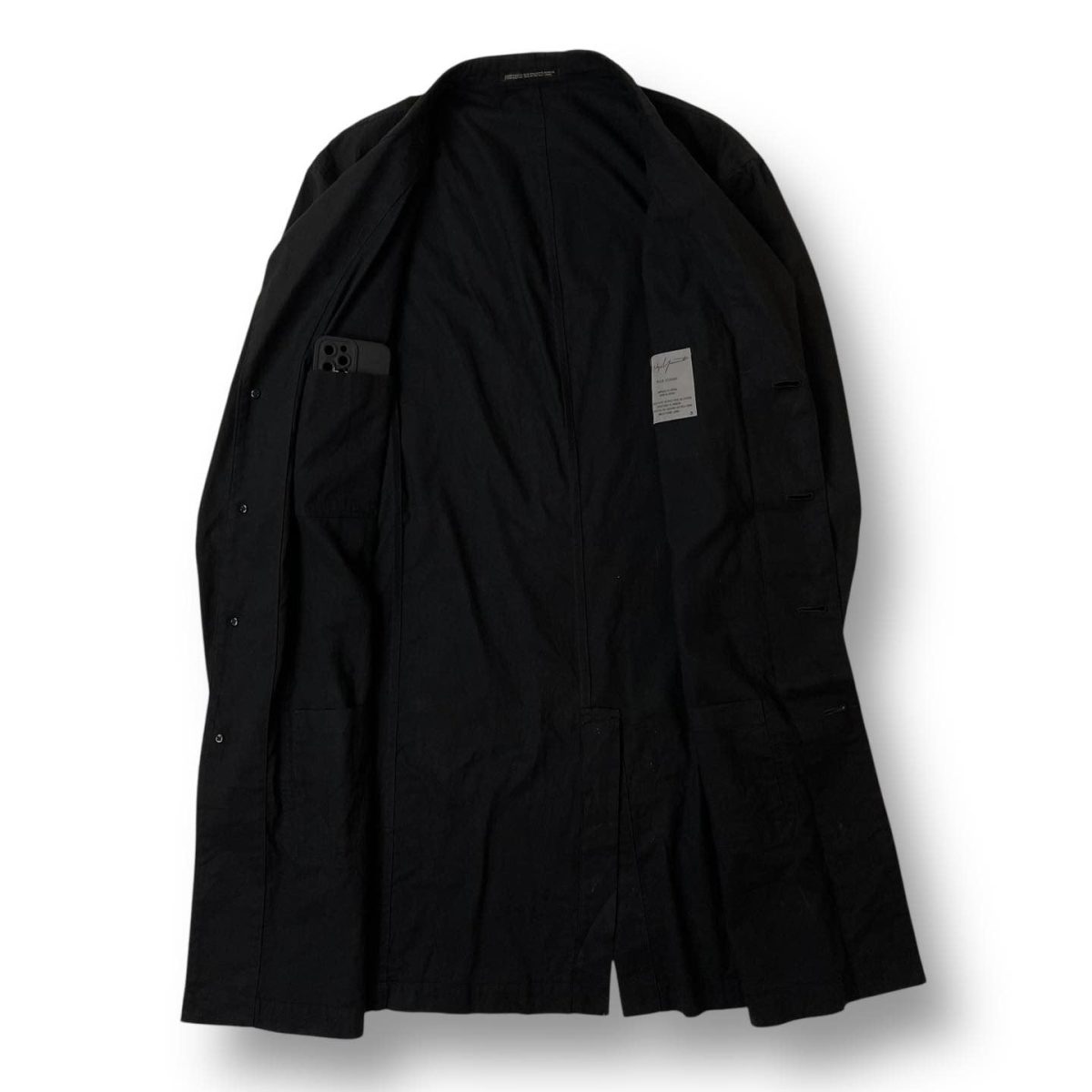 A sophisticated long coat featuring Yohji’s iconic unstructured tailoring.
